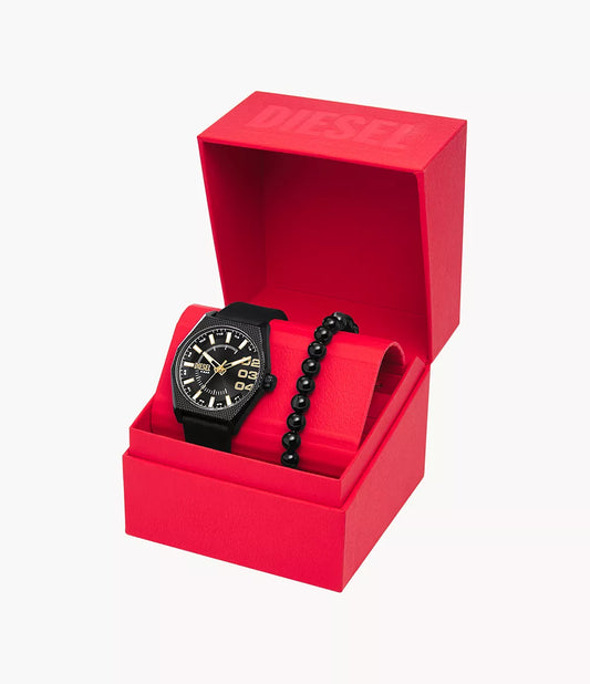 Diesel Scraper Three-Hand Black Leather Watch and Bracelet Set DZ2210SET