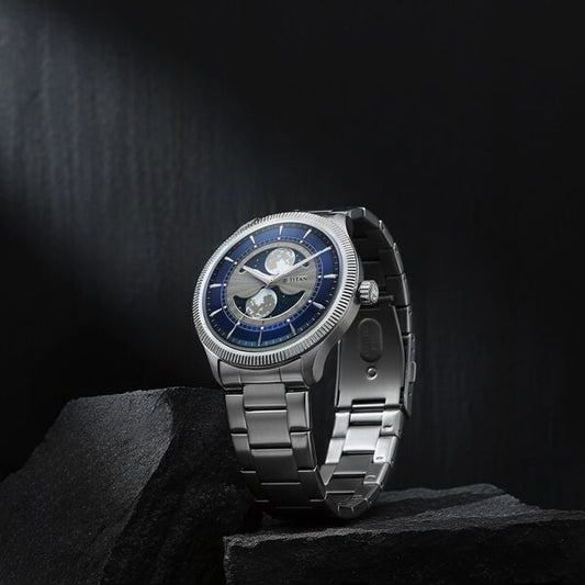 Titan Stellar Analog with Dual Moon Phase and Blue Dial Silver Stainless Steel Strap Watch for Men 10050SM01