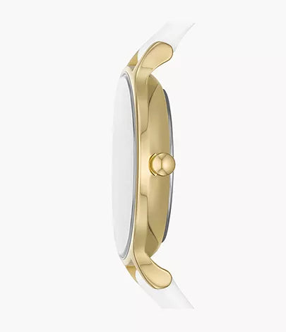 The white leather strap perfectly complements the gold-toned case, creating a chic and stylish accessory that effortlessly transitions from day to night. The single prong strap buckle ensures a secure and comfortable fit.