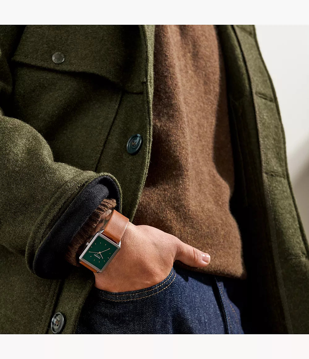 This 36mm Hagen features a green sandblasted dial, three-hand movement and brown leather strap.